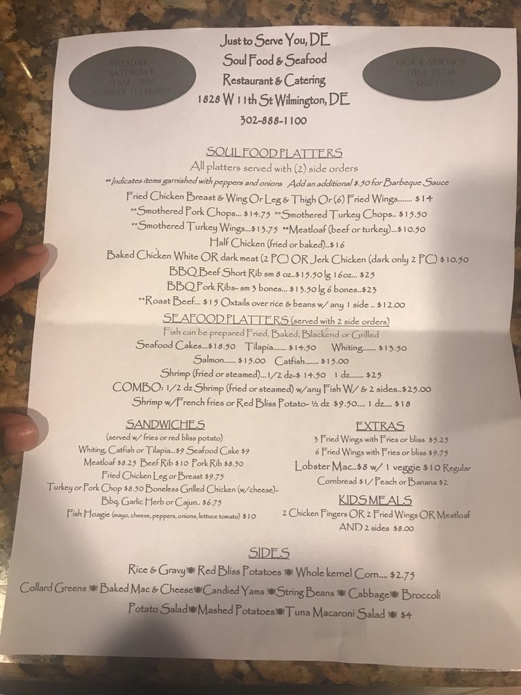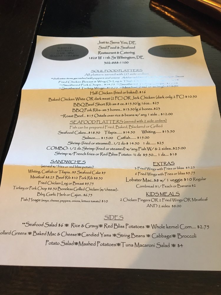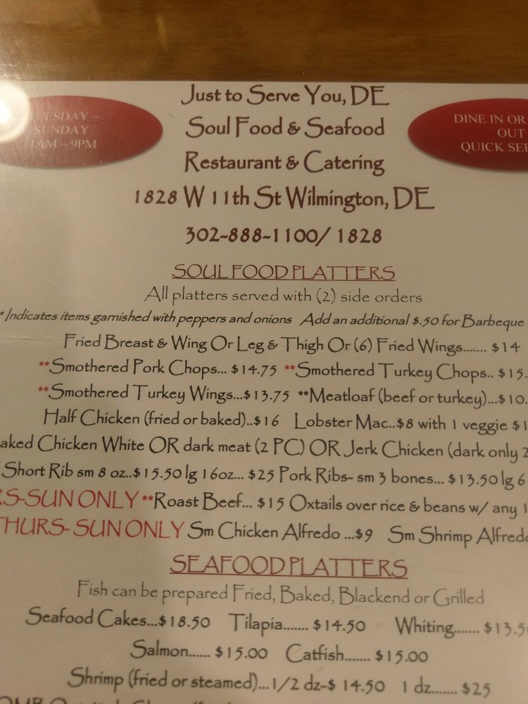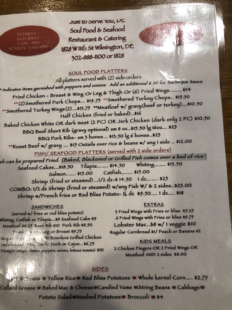 Just To Serve You, DE offers a menu filled with delectable soul food and seafood dishes. From Whiting and Catfish sandwiches to Wings and Turkey wings platters, each item is packed with flavor and generous portions. Customers rave about the Turkey wings, Jerk Chicken, and the meatloaf, all served with a variety of sides like mac and cheese and yams. The reviews mention friendly staff, cozy atmosphere, and the must-try dessert, the strawberry shortcake cheesecake. Overall, Just To Serve You, DE provides a satisfying dining experience with a Southern soul food flair that keeps customers coming back for more. Don't miss out on the chance to indulge in comforting and delicious dishes in the heart of Wilmington, DE.